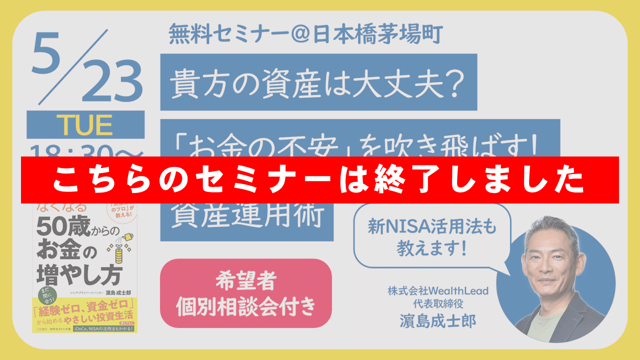 | 講師 | 濵島成士郎 | 株式会社WealthLead 代表取締役 日本ではまだ全国275名しかいない(2023年3月時点)、「日本証券アナリスト協会認定シニア・プライベートバンカー」の資格を保有。東京都主催の金融セミナー講師も務めるなど、数多くの講演実績あり。 |